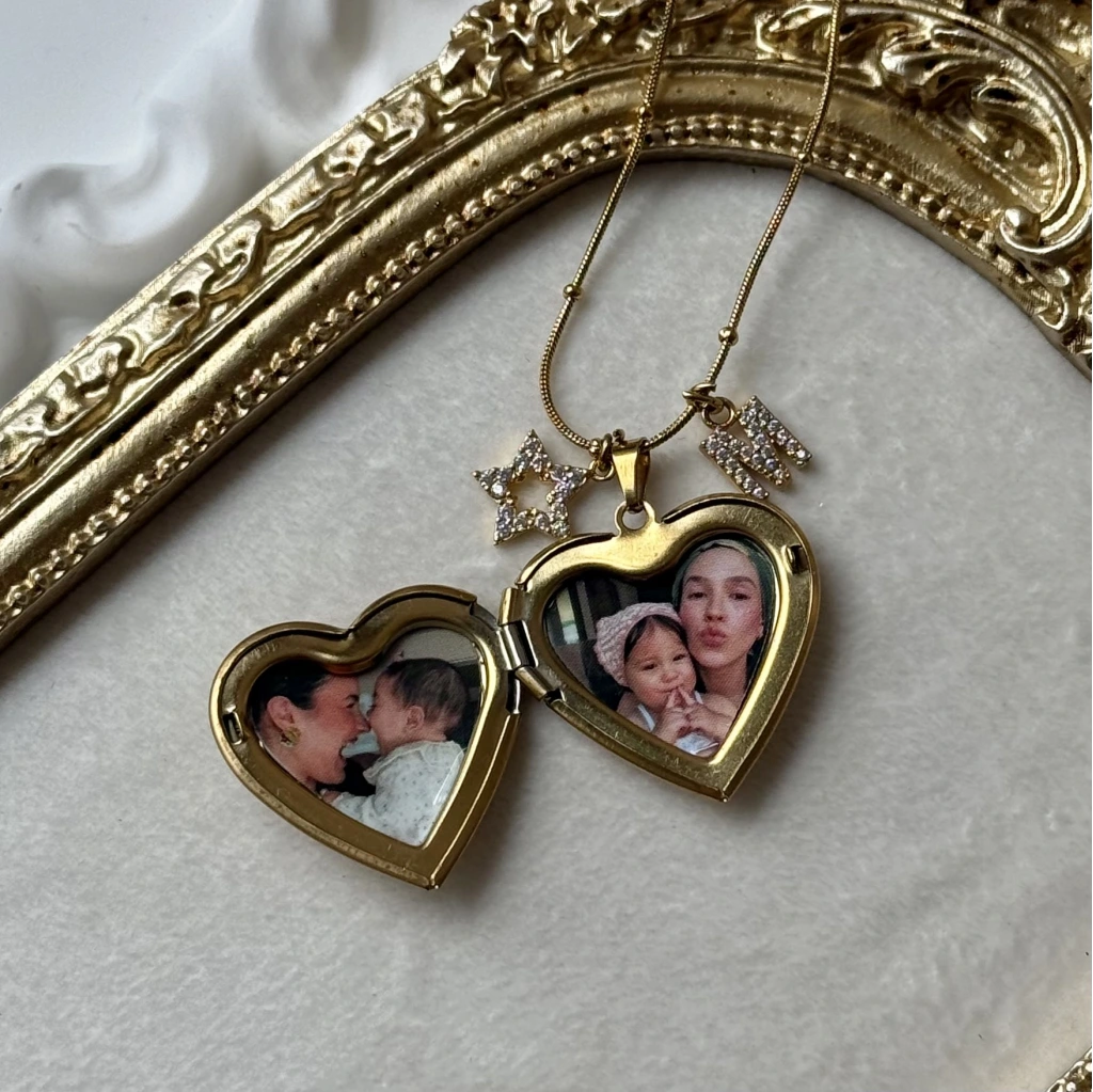 Beyaz Taş Detaylı ve Çift Fotoğraflı İşlemeli Kapaklı Kalp Kolye | (2,1 cm)