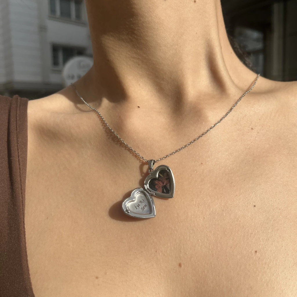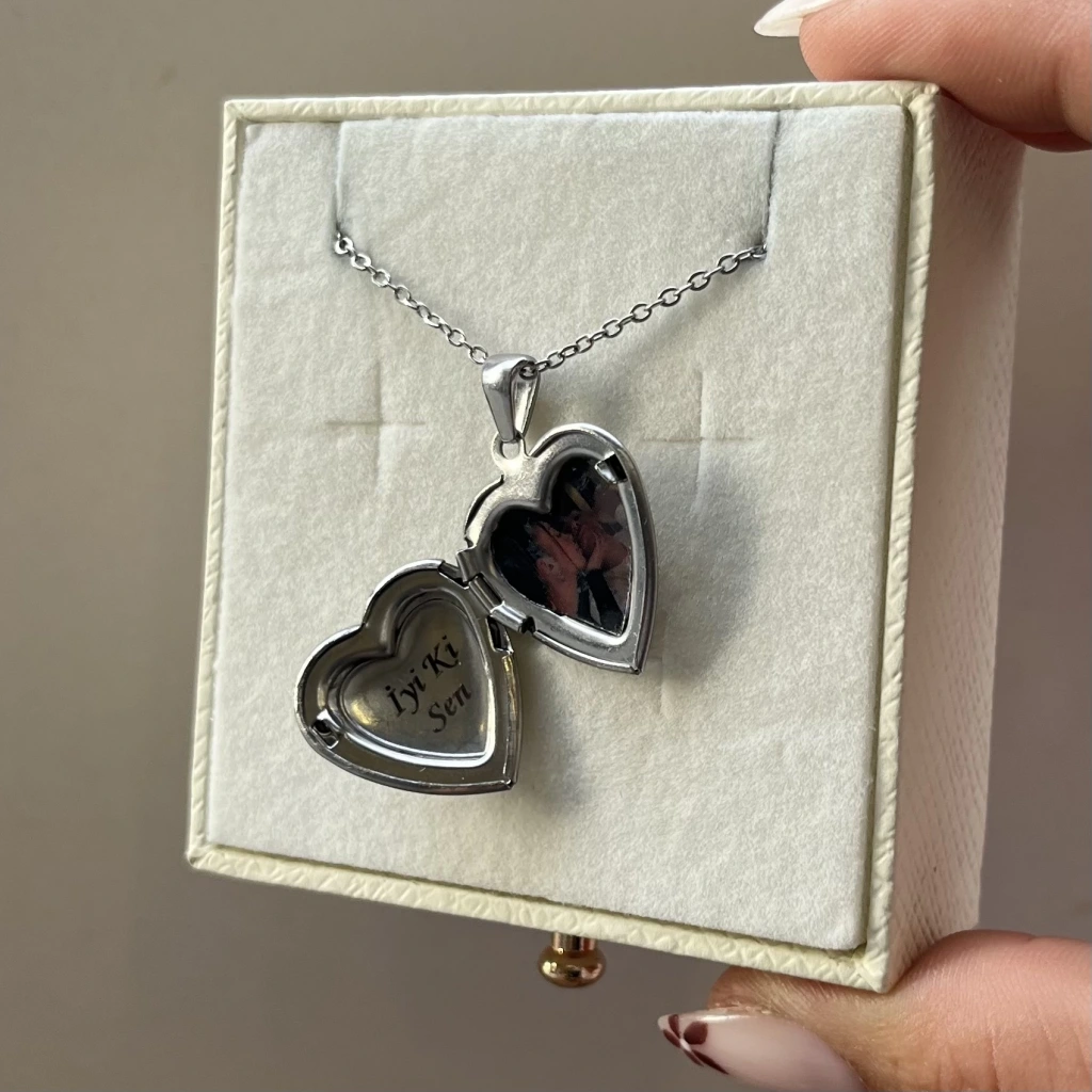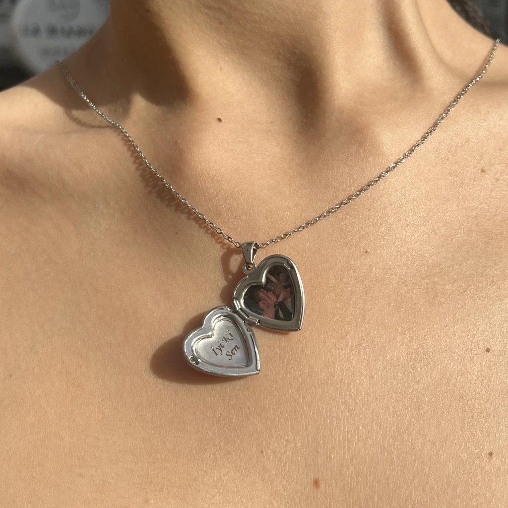 Fotoğraflı ve Yazılı Kalp Desenli Kapaklı Kolye (1,5 cm)