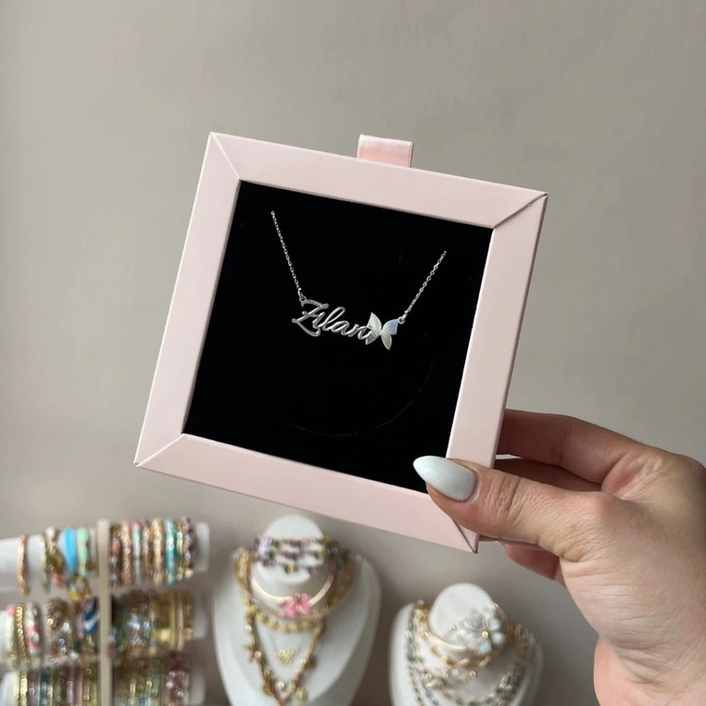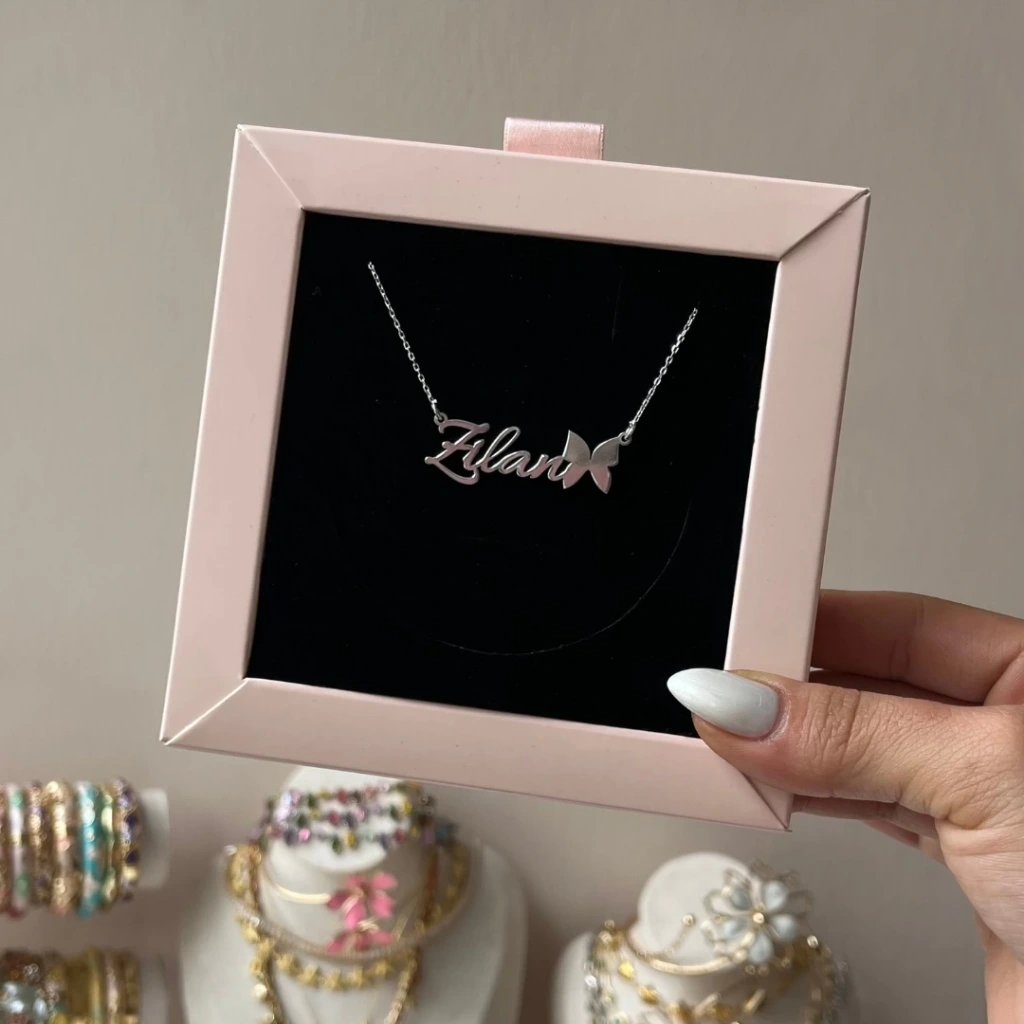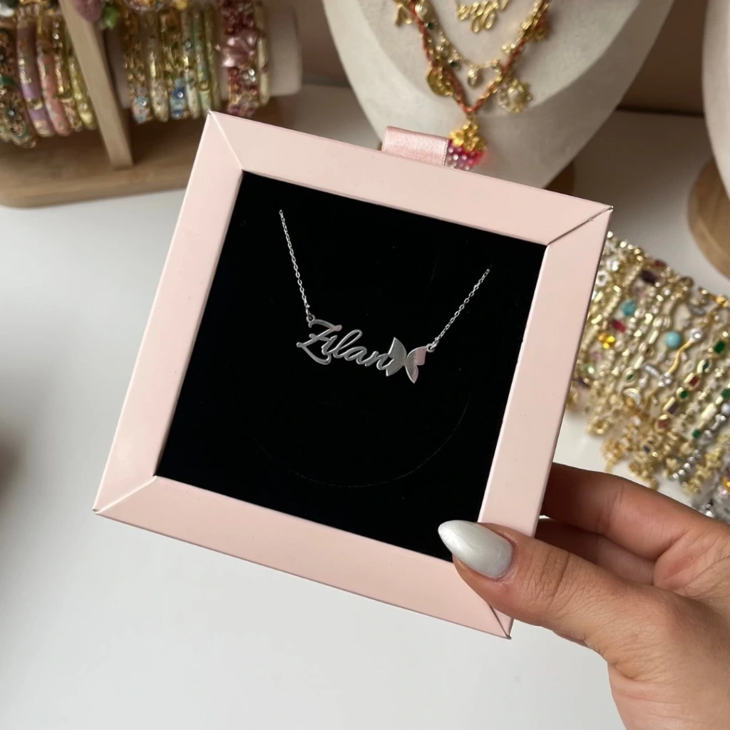 • Kelebek Detaylı Kişiye Özel İsim Gümüş Kolye