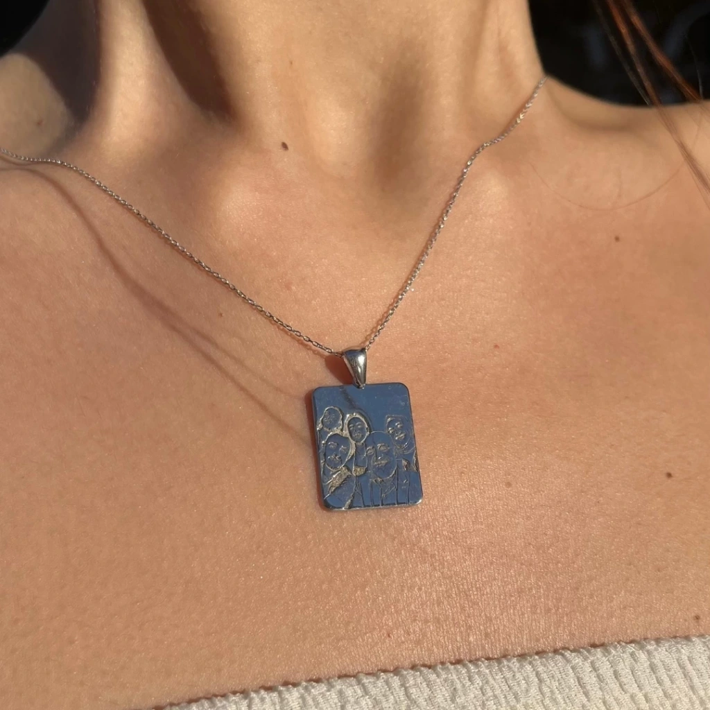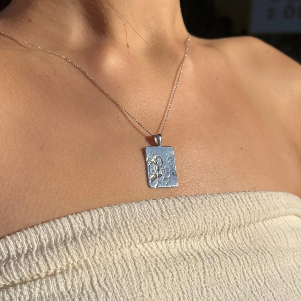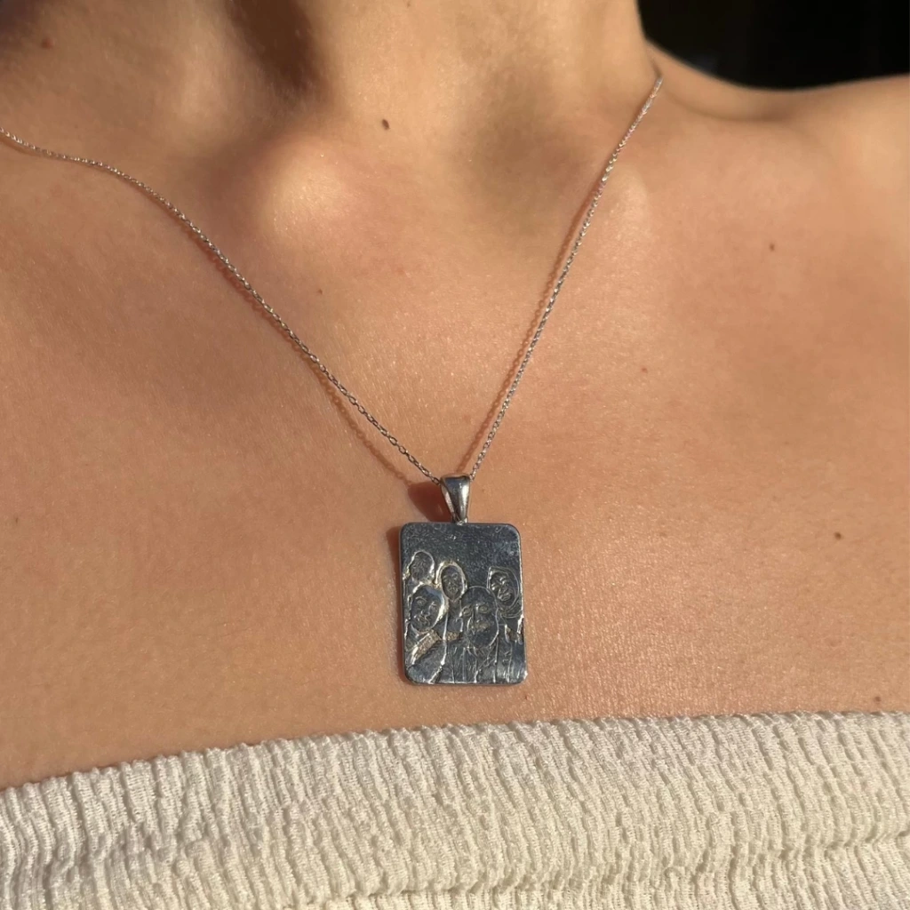 Kesik Plaka Çizgisel Portre Kolye | 925 Gümüş