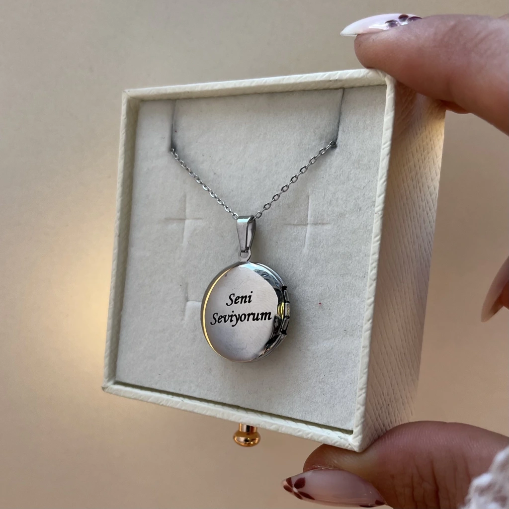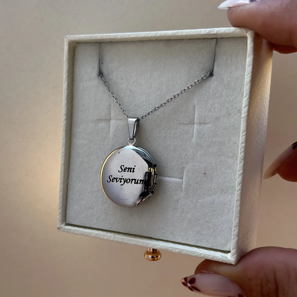 • Ön Kapak Yazılı Çift Fotoğraflı Yuvarlak Kapaklı Altın Kolye (1,5 cm)