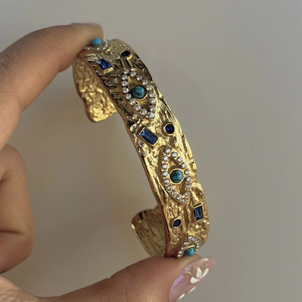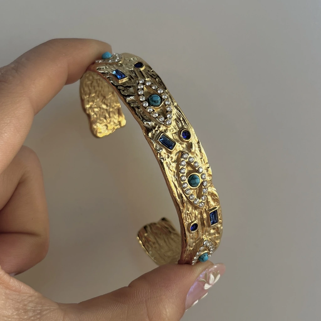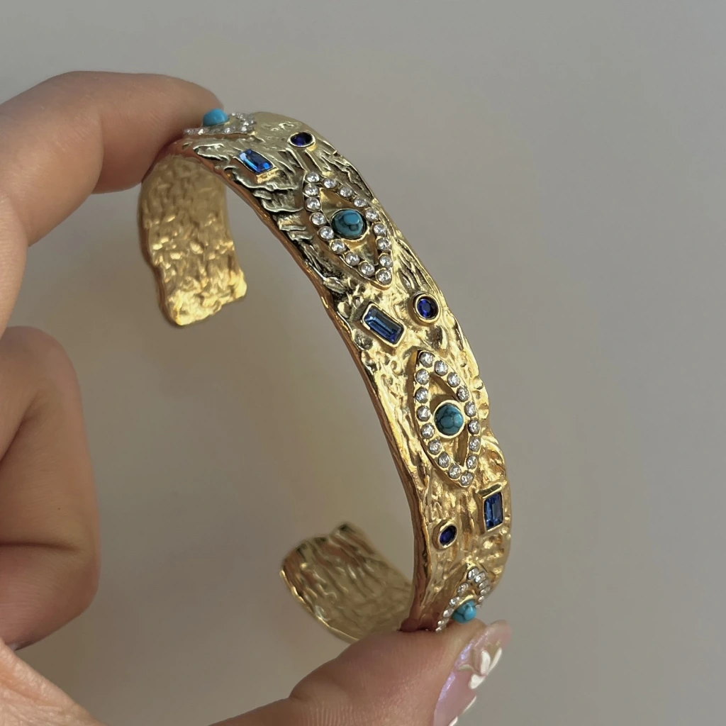 • Taşlı ve Göz Motifli Vintage Kelepçe Bileklik I Çelik