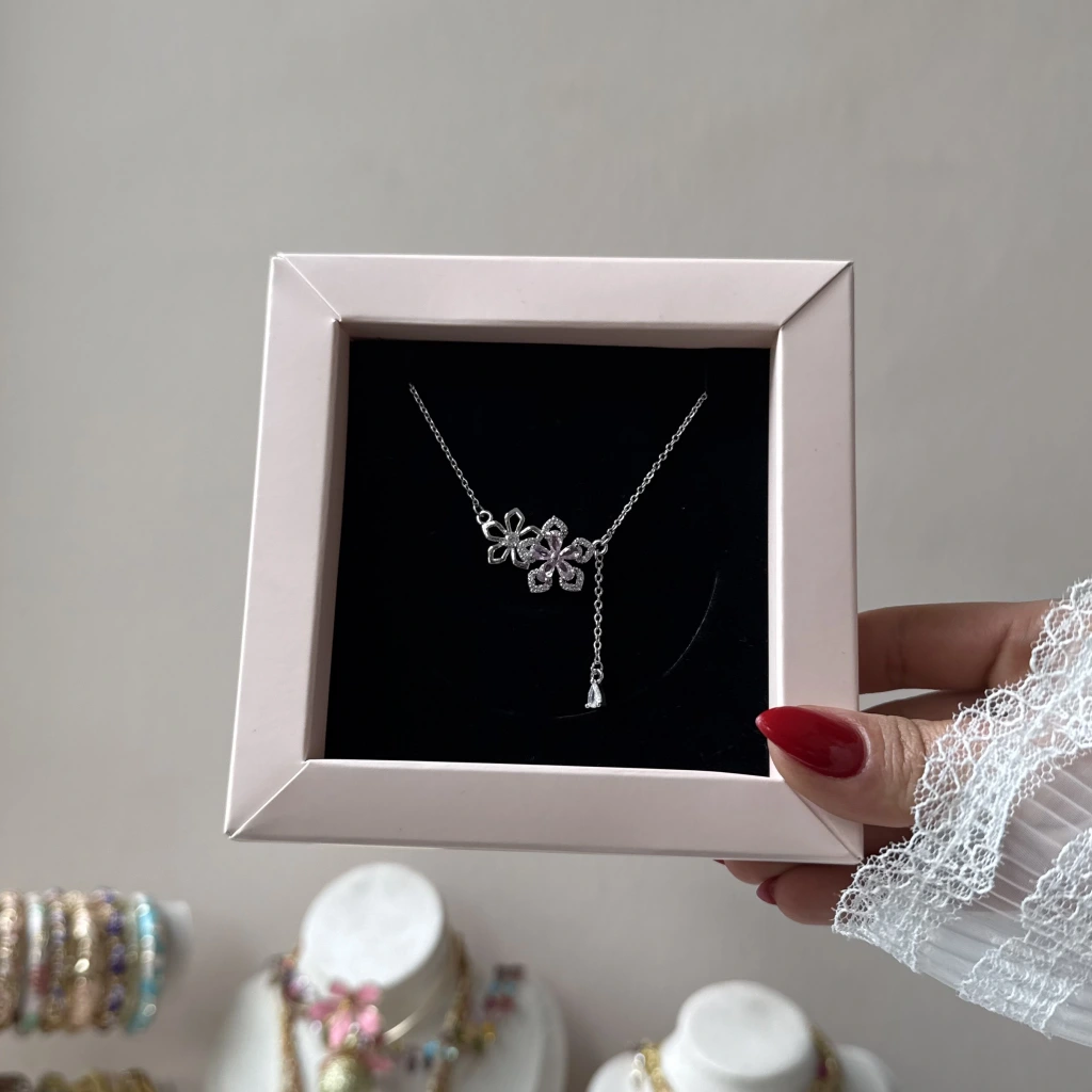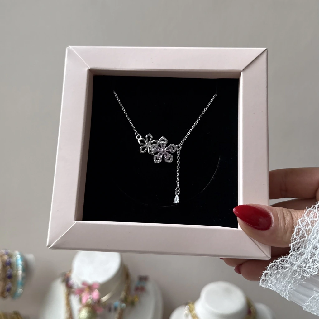 • Toz Pembe Taşlı Çiçek Kolye