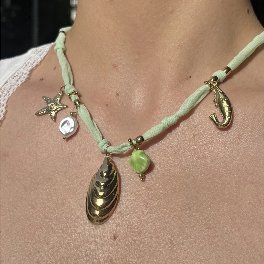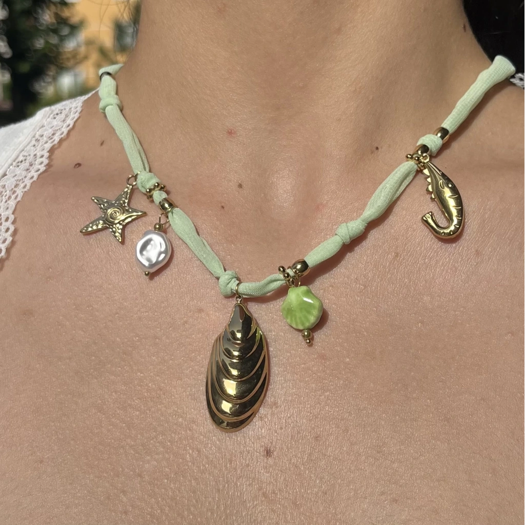 Yeşil Fularlı Altın Deniz Kabuğu Kolye